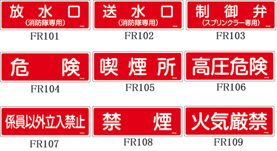 仕 様 ●材質:硬質エンビ ●仕様:表印刷 品番:記載内容 ●FR101(066101): 放水口(消防隊専用) ●FR102(066102): 送水口(消防隊専用) ●FR103(066103): 制御弁(スプリンクラー専用) ●FR104(066104): 危険 ●FR105(066105): 喫煙所 ●FR106(066106): 高圧危険 ●FR107(066107): 係員以外立入禁止 ●FR108(066108): 禁煙 ●FR109(066109): 火気厳禁