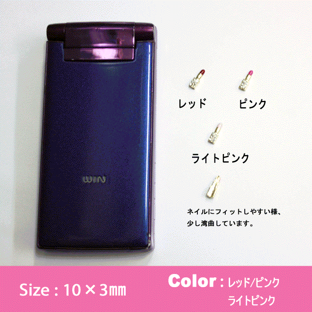 10×3mm注文番号 No,サイズ 約【縦幅】10mm×【横幅】3mmカラー レッド/ピンク/ライトピンク材 質 メタル(メッキ加工)商品説明 デコ電メタルパーツ ミニチュアリップスティックはその名のとおり、可愛らしい口紅のデコ電・ネイル用パーツです。